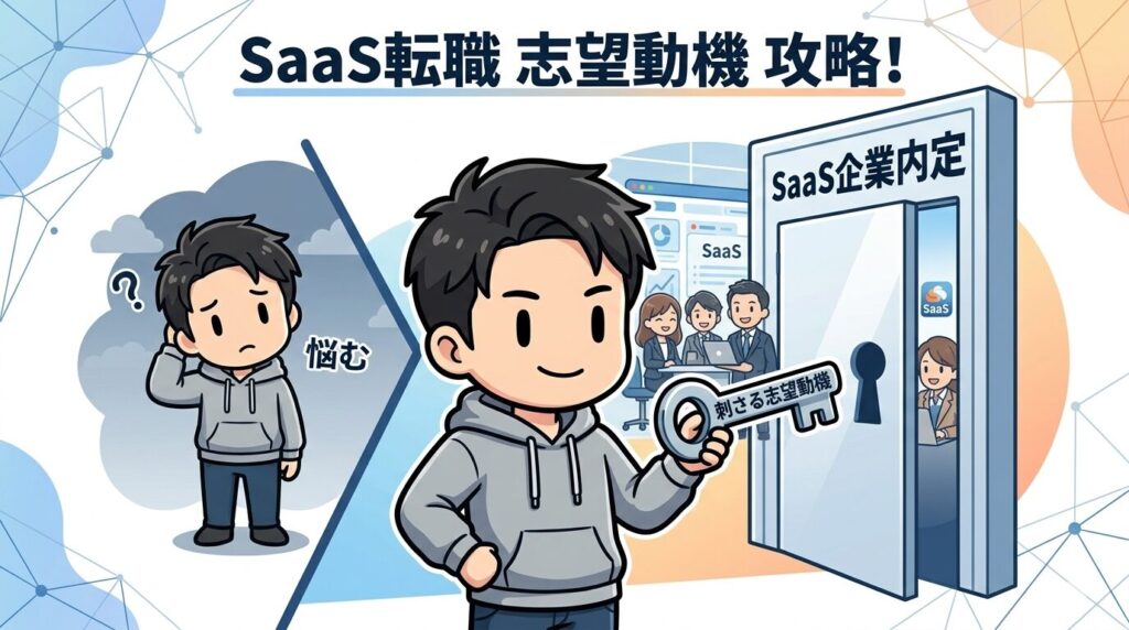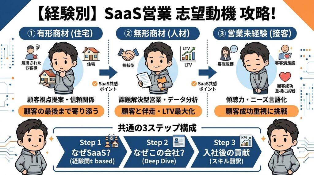 💡 ポイント: いずれの例文も「① なぜSaaS → ② なぜこの会社 → ③ 入社後の貢献」の3段構成で書かれています。この流れを崩さなければ、どんな経歴でも説得力のある志望動機が作れます。