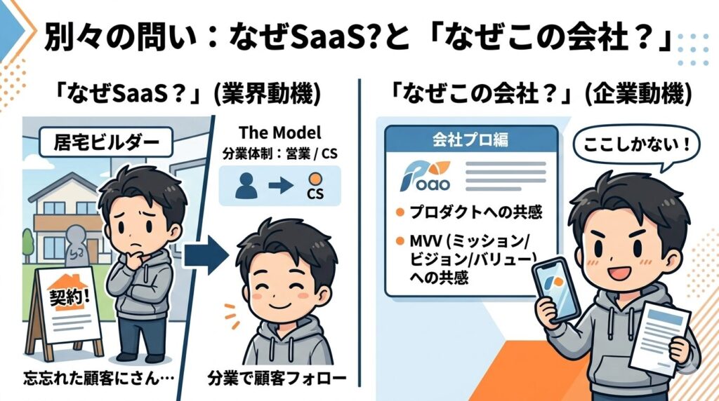 ここで多くの人が混同するのが、「なぜSaaS業界か」と「なぜこの会社か」は別の問いだということ。