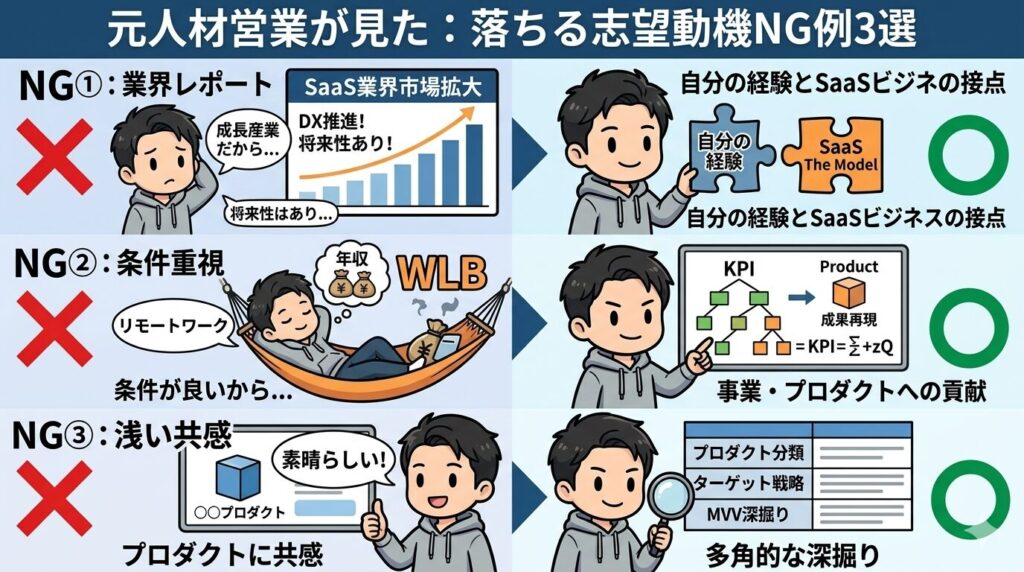 - NG例に注意する ── 業界の話だけ、条件面、感想文にならないように