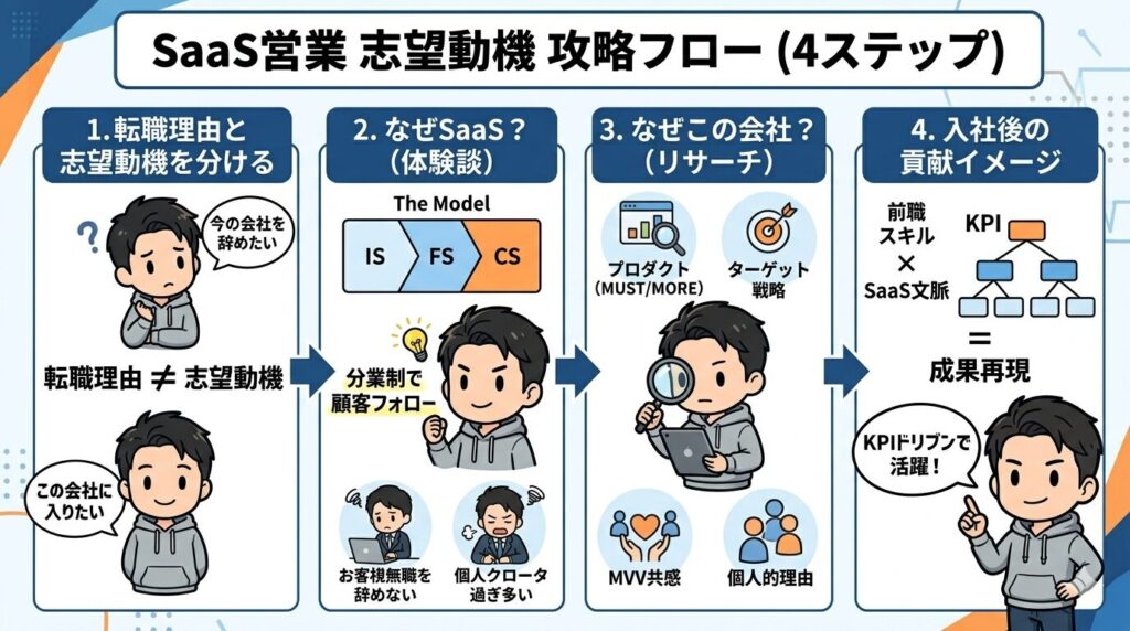 ここからが本題です。SaaS営業の志望動機を、4つのステップで組み立てるフレームワークをお伝えします。